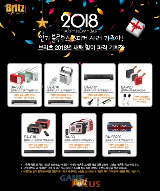 음향기기 전문기업 브리츠가 2018년 새해를 맞아 인기 블루투스 스피커의 가격할인과 포토상품평 이벤트 등 파격적인 기획전을 진행한다.