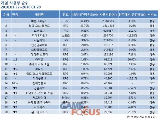 미디어웹이 제공하는 '게임트릭스 주간 종합 게임 동향'에 따르면, 1위를 차지한 '배틀그라운드'는 PC방 사용률이 전주대비 3.24% 증가한 34.01%를 기록하였다. 최근 '카카오 배틀그라운드'가 15세 이용가를 시작하며 점유율 상승과 함께 더 다양한 연령층의 지지를 받게 된 것으로 보인다.