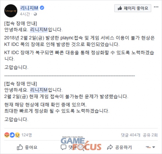 게임 접속이 원활하지 않은 문제는 오늘(2일) 오전부터 발생했다. 엔씨소프트 측은 '리니지M' 공식 페이스북을 통해 "2월 2일 현재 게임 접속이 불가능한 문제가 발생했다"라며 "최대한 빠르게 정상화 될 수 있도록 노력하겠다"라고 공지했다.