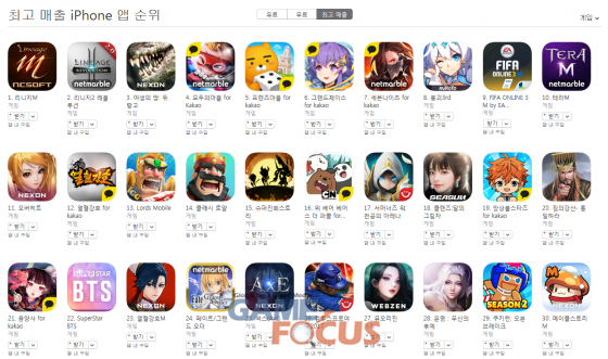 이번 주 애플 앱스토어 매출순위에서는 각종 논란과 악재를 이겨내고 상위권에 자리하는데 성공한 '야생의 땅: 듀랑고'가 돋보인다. '야생의 땅: 듀랑고'는 지난주에 이어 이번 주에도 3위 자리를 지키면서 '리니지2 레볼루션'을 위협하고 있으며, '모두의 마블'과 '프렌즈 마블'이 그 뒤를 이었다.