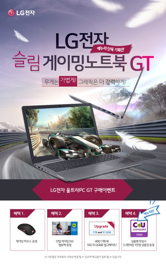 이번 이벤트는 LG 울트라PC GT를 구매하는 모든 고객에 게이밍 마우스와 인텔 게이밍 SW 밸류팩을 증정하고 저장 장치를 하드 1TB와 SSD 512GB로 업그레이드 해준다. 또한 상품 구매 후 에누리 쇼핑지식에 포토 리뷰를 작성하는 고객 모두에게 CU 편의점 상품권 1만원권을 증정한다.