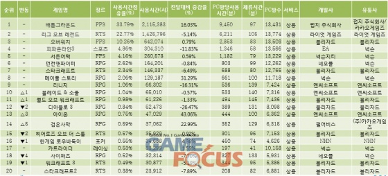 한편, 11위에서 20위권의 게임은 많은 순위 변동이 있었다. 가장 큰 증감률을 보인 '아이온'은 부분 유료화를 진행하며 전달대비 증감률 43.06% 상승, 전체 순위 통틀어 가장 큰 상승폭을 보였다. 반대로 '디아블로 3'는 전주대비 증감률이 -26.47% 감소하며 두 단계 하락한 12위에 자리하였다.
