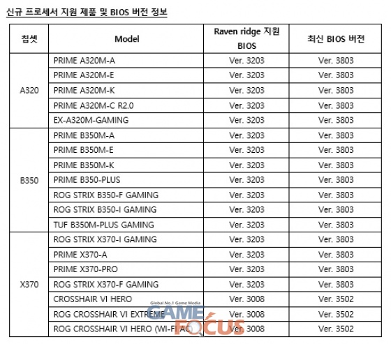 이를 위해 에이수스는 신규 프로세서의 활용을 위한 새로운 BIOS를 배포 중에 있다. 이 신규 BIOS는 모든 AM4 소켓 기반의 X370, B350, A320 칩셋 메인보드 제품 군에 대해 제공되며, 에이수스 공식 홈페이지를 통해 다운로드 받을 수 있다.