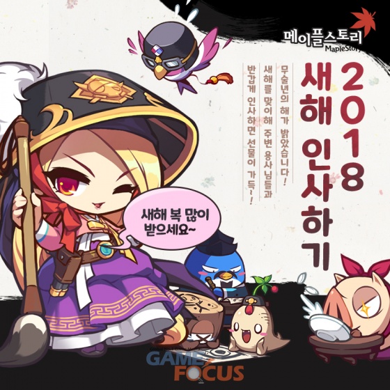 '메이플스토리'에서는 'ARK 코인샵 시즌2'에 '따끈따끈 떡국', '복조리 라이딩 교환권' 등 설날 아이템을 추가하고 다양한 설 이벤트를 실시한다. 다른 유저와 정겨운 새해 인사를 나누면 'ARK 코인 100개' 등 아이템을 지급하는 '2018 새해 인사하기'와 '창공의 연타기', '초능력 윷놀이' 등 미니게임 플레이 시 다양한 아이템을 선물하는 '껨디의 설날 놀이마당'을 진행한다. 또 '황금 강아지 복주머니', '황금 강아지 새해 선물 받아가세요!', '매일매일 설날 선물!' 이벤트 등으로 유저들에게 풍성한 혜택을 제공한다.