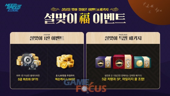 '니드포스피드엣지'에서는 22일까지 '설맞이 1판 이벤트'를 진행한다. 이벤트 기간 동안 게임에 한 판만 참여해도 '1,000,000 SP'를, 설 연휴 기간에는 '4,000,000 SP'와 함께 추첨을 통해 총 6000명에게 '넥슨캐시 5천원권'을 지급한다. 이 밖에도 7일 이상 설날 이벤트에 참여한 유저 전원에게는 'S급 재료 30개'를 증정한다.