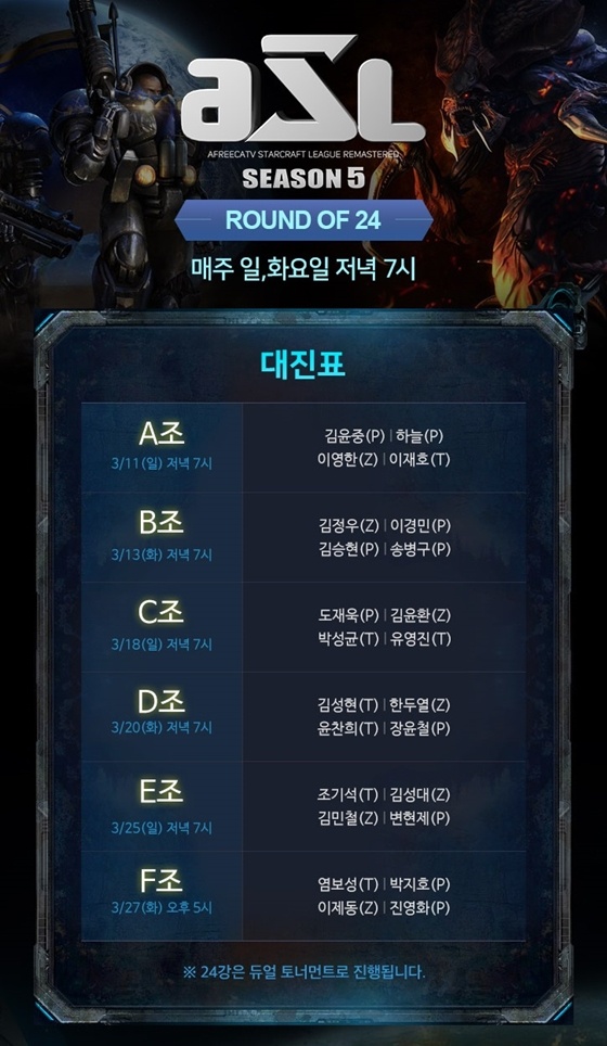 ASL 시즌5 24강은 오는 11일 개막전을 시작으로 27일(화)까지 매주 일, 화요일 오후 7시 서울 대치동 프릭업 스튜디오에서 생중계된다. 또한 오는 27일 마지막 24강 경기 종료 후 16강 조지명식이 연달아 열린다. 보다 자세한 사항은 ASL 공식 홈페이지에서 확인할 수 있다.