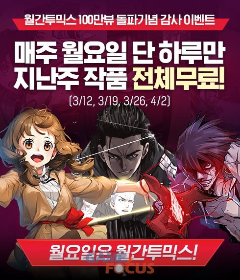 투믹스는 100만 뷰 돌파를 기념해 독자들의 성원에 보답하는 무료 공개 이벤트를 준비했다. ‘월간 투믹스’ 회차가 오픈되는 매주 월요일 하루, 앞선 주차 작품을 무료로 공개한다. 4주차 작품이 적용되는 내달 2일까지 진행된다. 더 많은 독자들이 ‘월간 투믹스’를 접할 수 있도록 하기 위한 취지로 기획됐다.