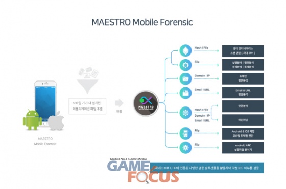 포렌식 제품을 국산화 시킨 ‘마에스트로 모바일 포렌식’은 모바일 기기 내 설치 된 모든 모바일 앱(App)을 자체 보유한 다양한 방법을 통해 추출한 후, 파일의 악성여부를 자동 분석•검증•차단하는 지능형 보안 인텔리전스 플랫폼인 ‘마에스트로 사이버보안 위협 인텔리전스 통합 플랫폼(Maestro Cyber Threat Intelligence Platform, 이하 CTIP)’으로 전송된다. 이후 마에스트로 CTIP와 연동된 다양한 검증 솔루션들을 활용하여 악성 앱을 신속하고 정확하게 탐지 및 분석한다.