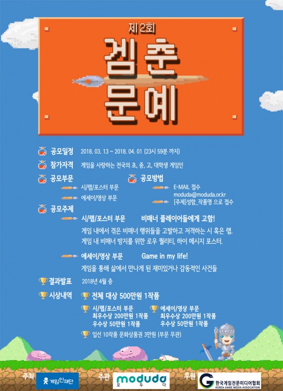 재단법인 게임인재단이 주최하고 소셜벤처기업 모두다(대표 박비)가 주관하며 한국게임전문미디어협회가 후원하는 게임 창작 대회 '제 2회 게임인 겜춘문예(이하 겜춘문예)'가 4월 1일까지 참가 모집을 시작한다.