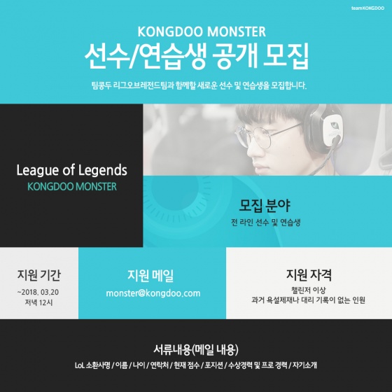 e스포테인먼트 기업 콩두컴퍼니 산하 '리그 오브 레전드' 프로게임단 '콩두 몬스터'가 선수 및 연습생을 공개 모집한다.