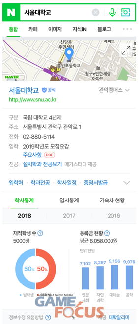 네이버 모바일 및 PC 검색창에 학교명 등을 입력하면, 해당 대학의 지난 3년간 주요 학사통계, 입시통계, 기숙사 현황을 바로 확인할 수 있다. 재적학생 수, 등록금 현황, 1인당 장학금, 입학 경쟁률, 기숙사 경쟁률 등 총 9개 항목이 제공된다.