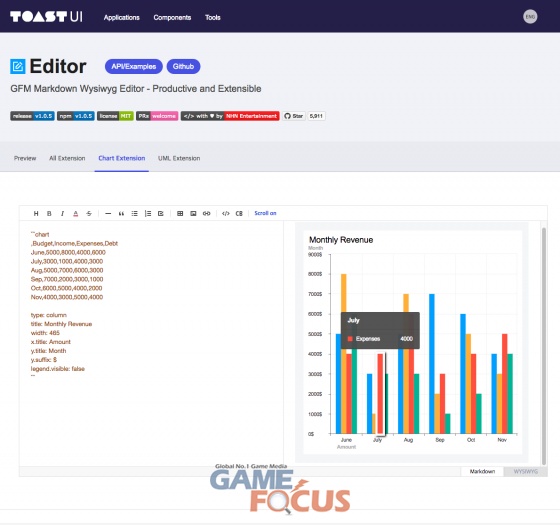 또한 홈페이지 개설에 맞춰 'TOAST UI Chart 3.0'도 공개됐다. 바, 컬럼, 라인, 맵 등 16종의 차트 디자인과 UI(사용자 인터페이스)가 개선되었으며, 플러그인 기능을 통해 추가적인 작업 없이 'TOAST UI Editor'를 바로 사용할 수 있도록 연동한 것이 특징이다.