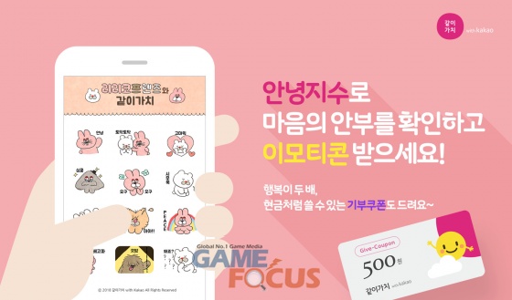 오는 3월 28일까지 같이가치 with Kakao의 마음날씨 서비스 사이트에 접속해 나의 심리상태를 체크하는 '안녕지수' 테스트를 완료하기만 하면, 참여자 모두에게 이모티콘과 기부쿠폰(500원)이 지급된다. 이벤트 페이지를 공유하면 추첨을 통해 노트북, 카카오미니 등 다양한 경품이 추가로 증정된다.