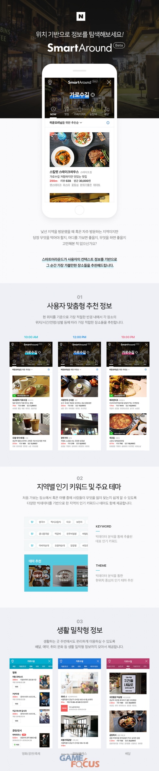 이로써 이용자는 '지역명 + 장소' 패턴의 키워드를 입력하지 않아도 스마트 어라운드를 통해 클릭 한 번으로 현재 위치, 시간대, 성별, 연령 등 컨텍스트(Context Embedded)에 따라 맛집부터 카페, 놀거리, 쇼핑센터 등 다양한 맞춤형 장소 정보를 접할 수 있게 됐다.
