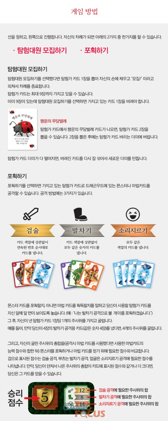 몬스터를 무찌르기 위해서는 세 가지 방법이 있다. 연속된 번호 순서대로 카드를 내는 '검술', 같은 숫자의 카드를 내는 '발차기', 같은 색깔의 카드를 내는 '소리지르기' 중에 어느 방법이 효과적일지 고민하는 전략적인 재미가 특징.