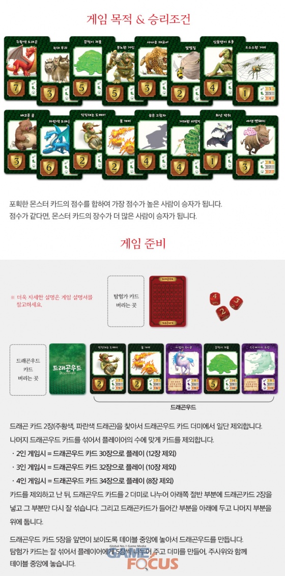 '드래곤우드'에서 플레이어는 탐험가가 되어 마법에 걸린 숲, 드래곤우드를 여행한다. 카드를 내서 주사위를 얻고 주사위를 굴려서 사악한 몬스터를 무찌르거나, 탐험에 필요한 마법 아이템을 얻을 수 있다.