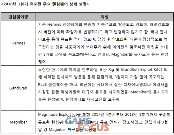 또한, 올해 1분기 유포된 주요 랜섬웨어로는 ▲헤르메스(Hermes), ▲갠드크랩(GandCrab), ▲매그니버(Magniber) 등이 있다고 덧붙였다.