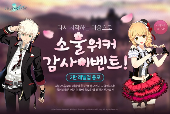 또한 4월 25일(수)부터 5월 30일(수)까지 최신형 그래픽 카드, 문화상품권, 소울워커 장마우스패드 등 현물 상품과 고급 아카식 레코드를 포함한 게임 내 아이템을 경품으로 지급하는 '레벨업 이벤트'가 유저들을 찾아간다. 유저들은 자신의 계정 내 가장 레벨이 높은 3개 캐릭터의 레벨을 합산한 숫자만큼 응모권을 받을 수 있으며 이벤트 기간 중 레벨이 상승하면 추가로 지급된다. 경품은 추첨을 통해 지급되며 당첨자는 6월 8일(금) 홈페이지를 통해 발표될 예정이다.