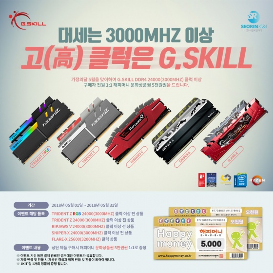 (주)서린씨앤아이(대표:전덕규)는 지스킬(G.SKILL)사의 방열판 적용 제품 중 24000(3000Mhz)클럭 이상의 고(高)클럭 전 제품 구매 시 해피머니 문화상품권을 증정 한다.