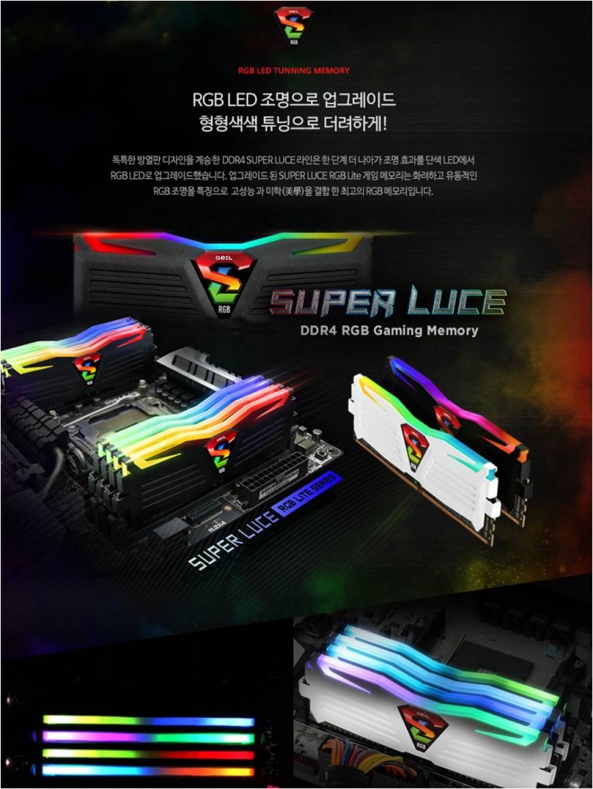 (주)서린씨앤아이(대표:전덕규)는 전세계 PC 마니아 들에게 각광을 받고 있는 게이밍 및 화려한 LED 튜닝 효과를 가진 게일(GEIL)사의 1680만 컬러 RGB LED 조명 슈퍼루스 RGB 라이트(SUPERLUCE RGB Lite) 25600(3200Mhz) 클럭 시리즈를 출시 했다.