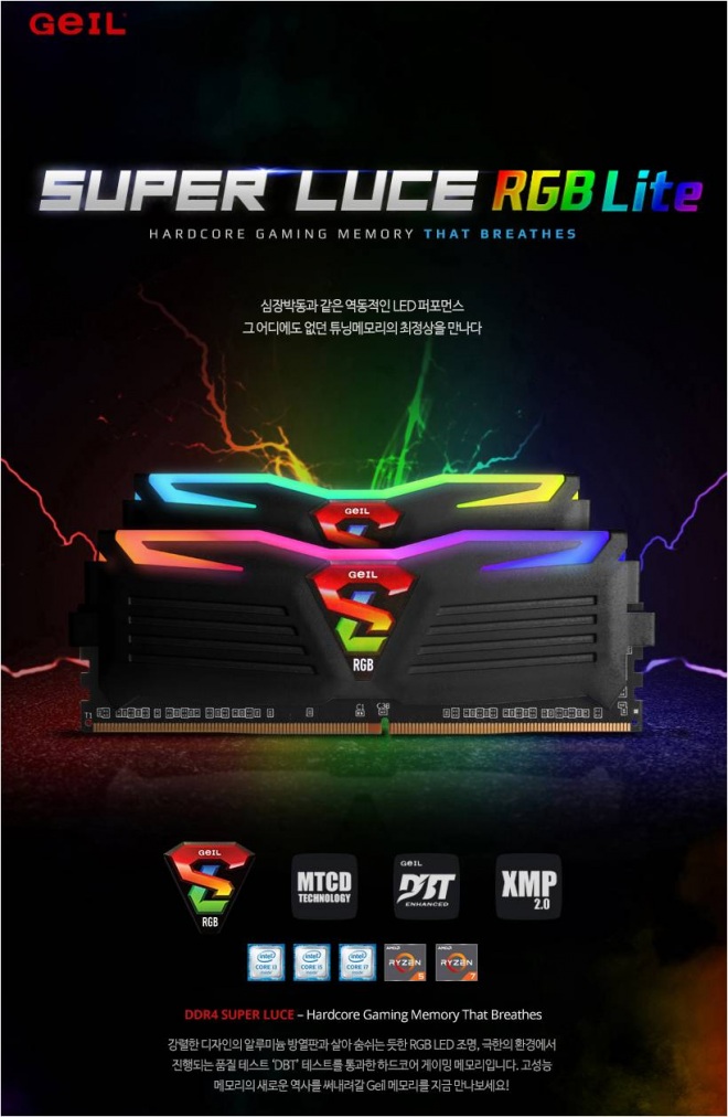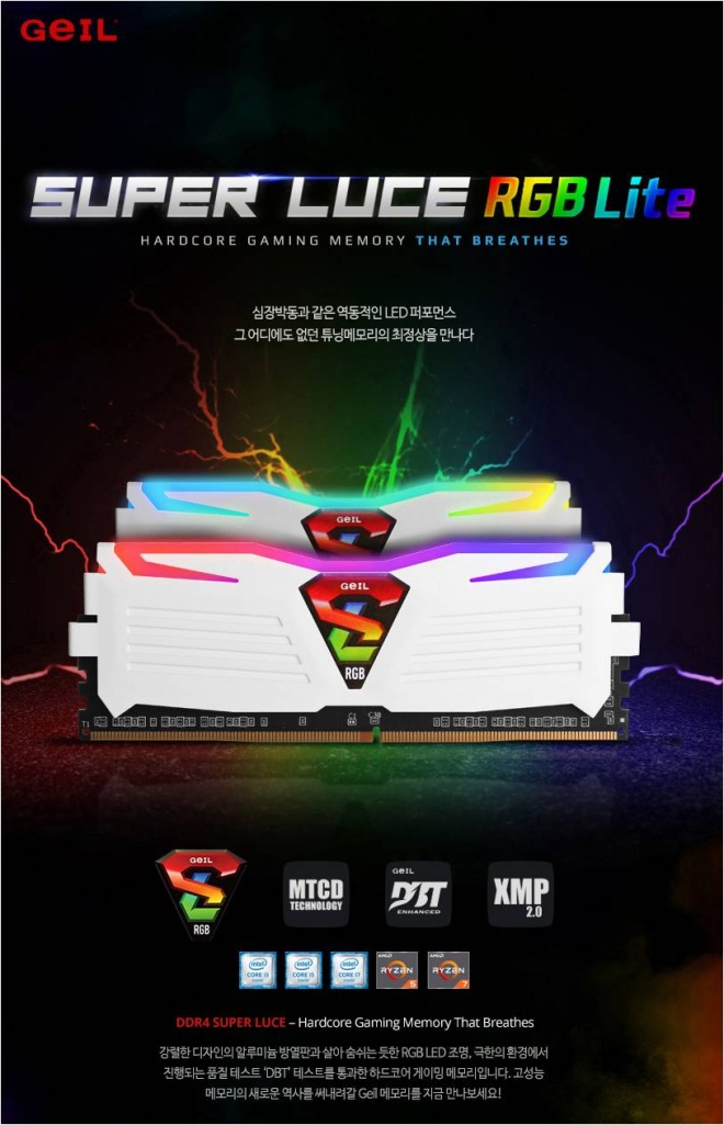 이번 DDR4 슈퍼루스 RGB 라이트 (SUPERLUCE RGB Lite) 25600(3200Mhz) 클럭 시리즈는 RGB LED의 대중화를 위한 제품으로 PC 사용자 누구나 화려하고 튜닝의 재미를 느낄 수 있게 기존 RGB LED를 사용하는 타 브랜드 제품보다 가격적으로 담백한 소비자가격을 보여주는 제품이다.