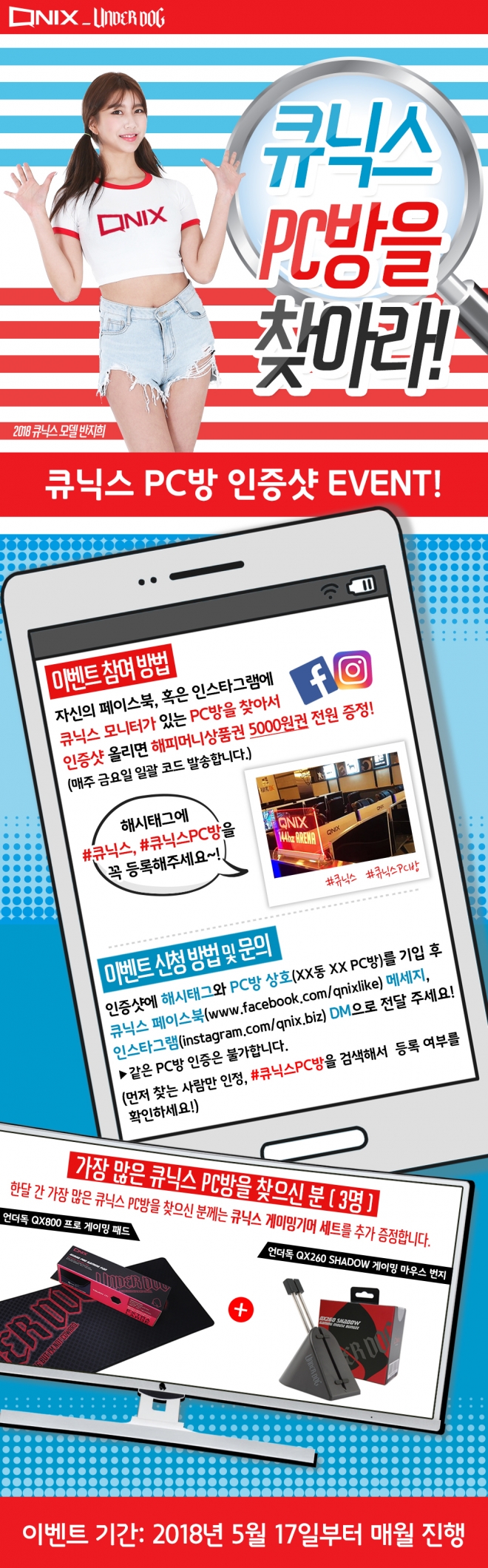 인증 이벤트에 참여한 PC방 이용자 전원에게는 해피머니 상품권 오천원권을 증정한다. 또 한 달 동안 가장 많은 큐닉스 PC방을 찾은 3명에게는 큐닉스_언더독 인기 게이밍 기어인 QX800 프로 게이밍 패드와 QX260 SHADOW 게이밍 마우스 번지를 추가 증정한다.