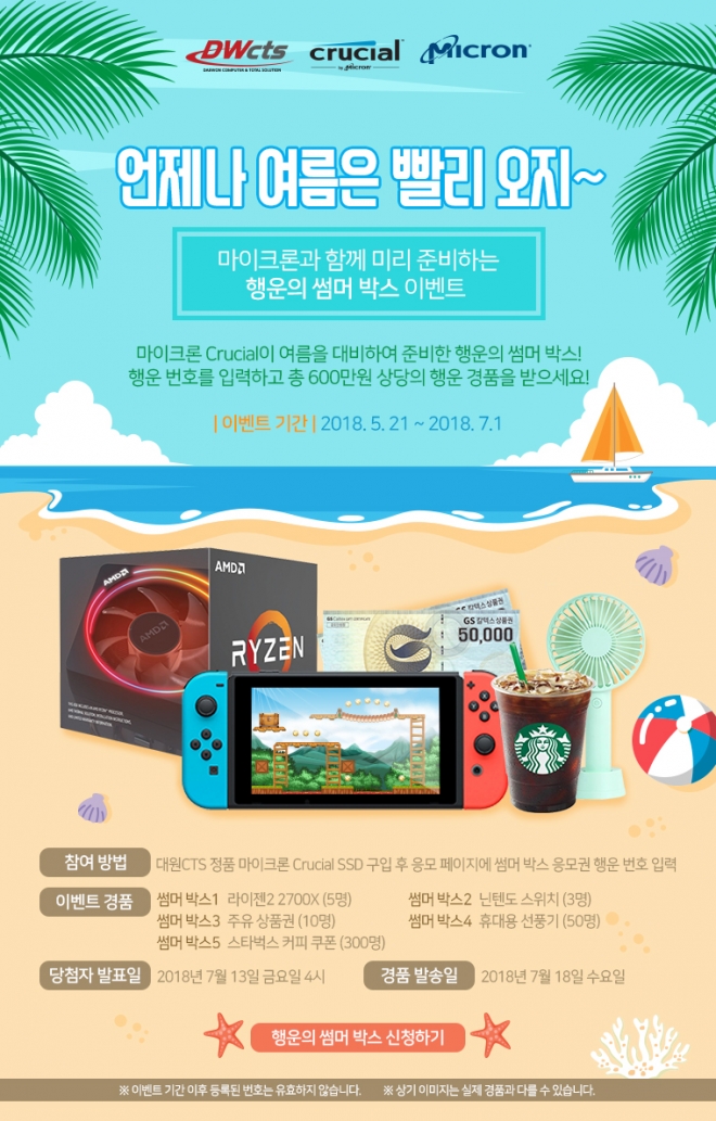 MX500 M.2 출시를 기념하여 진행되는 '여름은 언제나 빨리 오지~' 이벤트는 5월 24일부터 7월 1일까지 행사 기간 동안 마이크론 SSD대원CTS 마이크론 정품 제품 구매자를 대상으로 진행된다.