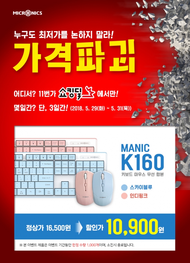 한미마이크로닉스(대표: 강현민, 이하 마이크로닉스)가 신규 출시한 무선 키보드 마우스 세트 제품인 'MANIC K160 무선 합본'의 파격 특가를 실시한다.