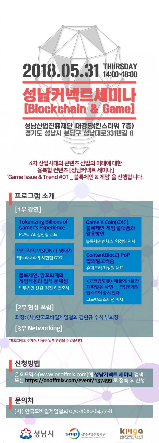 블록체인 기술을 활용한 게임산업의 새로운 생태계 조성을 위한 융복합 세미나인 '성남 커넥트 세미나'가 오는 31일(목), 성남산업진흥재단 대강당(정자역 킨스타워 7층)에서 개최된다.