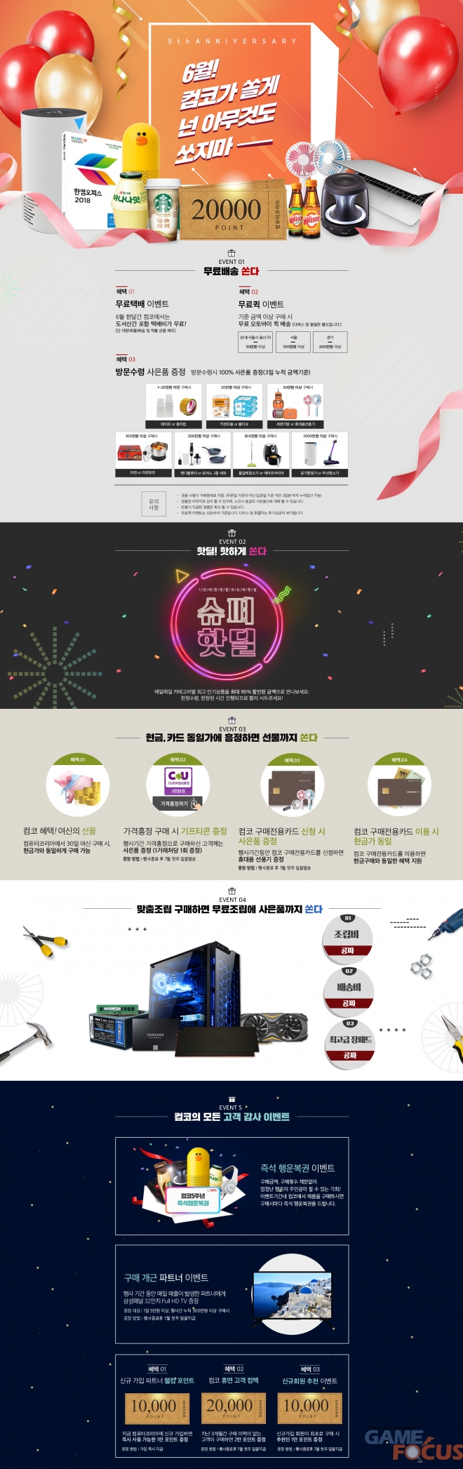 컴퓨터코리아 5주년을 맞이하여 진행되는 '6월은 컴코가 쏠게, 넌 아무것도 쏘지마!' 행사는 6월 1일부터 6월 29일 까지 한달 간 무료 배송, 핫딜, 사은품 증정 등 기존 고객은 물론 신규 고객까지 풍성한 혜택을 누릴 수 있는 이벤트로 다양하게 진행된다.