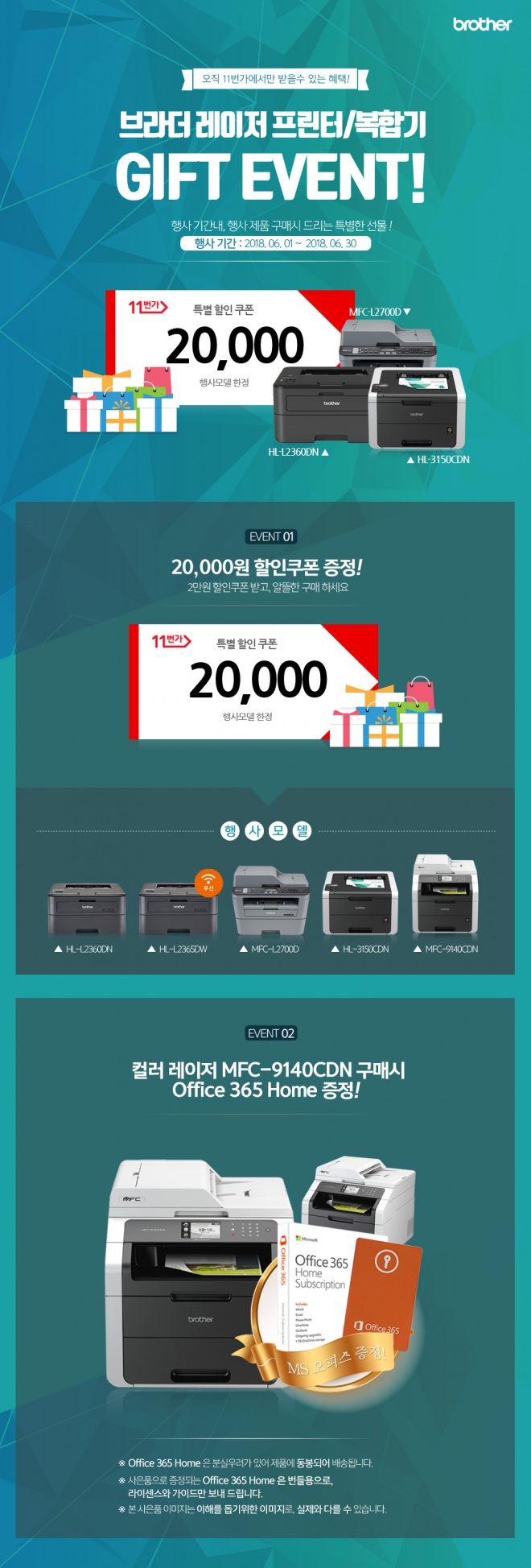 여기에 레이저 복합기/프린터 5종(HL-L2360DN, HL-L2365DW, MFC-L2700D, HL-3150CDN, MFC-9140CDN) 구매 고객 전원에게 2 만원의 할인 쿠폰을 제공하며 가장 상위 모델인 MFC-9140CDN 구매 고객에게는 마이크로소프트 오피스 365 홈 버전(7만원 상당)을 경품으로 제공한다.