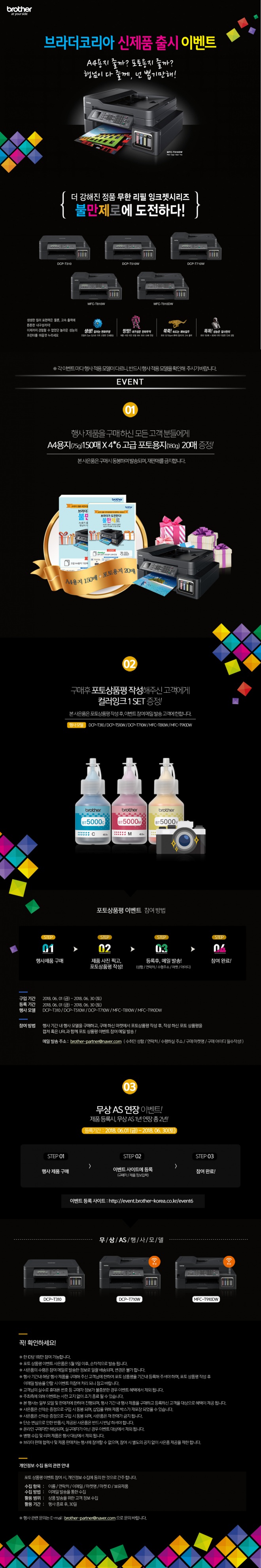이번 이벤트에서는 정품 무한리필 잉크젯 복합기 신제품 5종(DCP-T310, DCP-T510W, DCP-T710W, MFC-T810W, MFC-T910DW)을 구매한 고객 전원에게 A4복사용지(75g) 150매와 4x6 고급 포토용지(180g) 20매를 증정하며, 구매 후 포토상품평을 작성한 고객에게 컬러잉크 1세트(3종)을 제공한다. 또한 무한리필 제품 3종(DCP-T310, DCP-T710W, MFC-T910DW) 구입 고객에 한해, 이벤트 페이지에 제품 등록 시, 무상 AS 기간을 1년 연장하여 총 2년의 무상 AS를 제공하는 이벤트도 함께 진행한다.