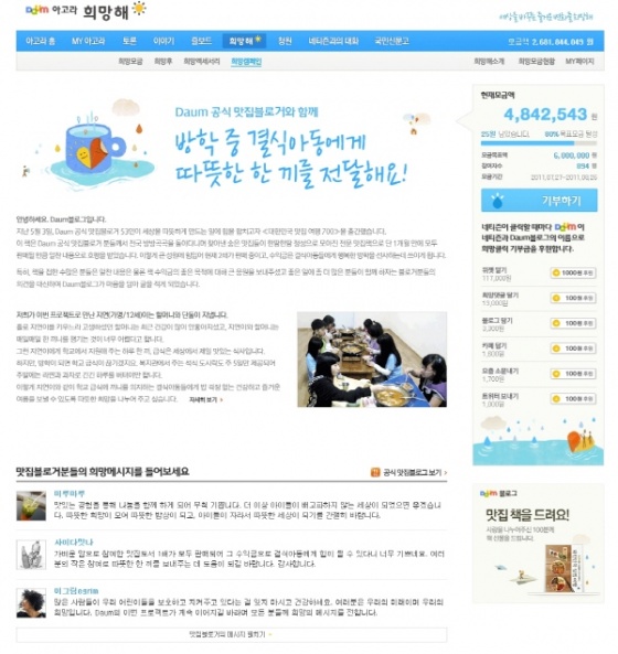 수익금 기부뿐만 아니라 보다 많은 네티즌들이 결식 아동 돕기에 참여할 수 있도록 ‘희망캠페인(http://hope.daum.net/campaign/foodblog.daum)’도 함께 진행한다. 맛집 블로거들은 희망메시지를 직접 작성하며 네티즌들의 참여를 독려하고 있다.