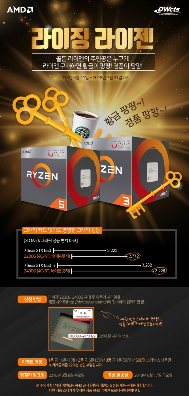 AMD 국내 공식 유통사인 대원CTS(대표이사 정명천)은 AMD 베가 그래픽 코어를 내장한 라이젠 2200G, 2400G에 대한 시장 확대를 위해 PC 조립업체를 대상으로 ‘골든 라이젠’ 프로모션을 진행한다고 밝혔다.
