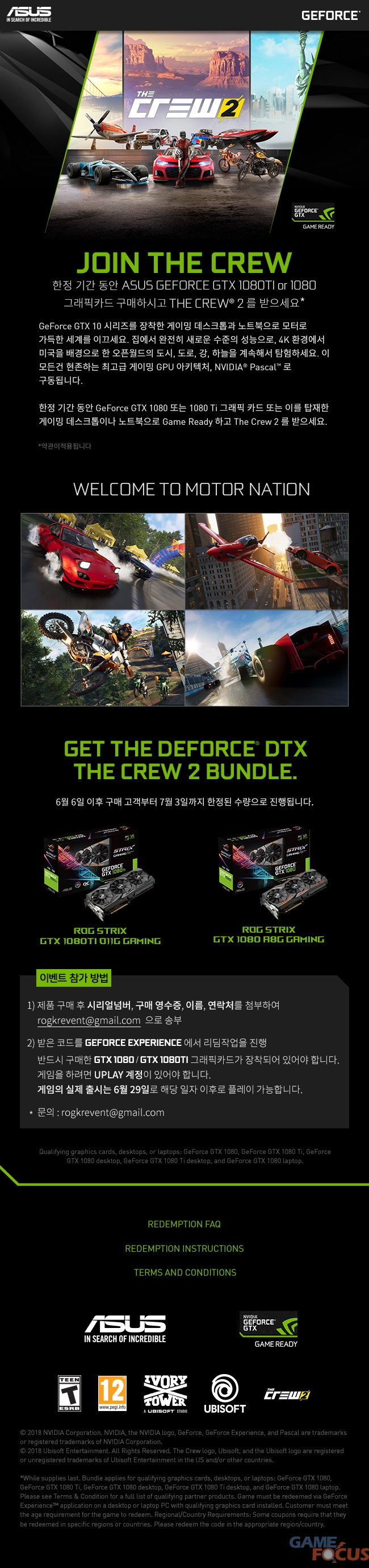 에이수스가 오는 7월 3일까지 'NVIDIA GEFORCE GTX 1080'와 'GTX 1080TI'을 구매한 고객을 대상으로 유비소프트에서 발매하는 레이싱 게임 'THE CREW 2'를 증정하는 프로모션을 진행한다.