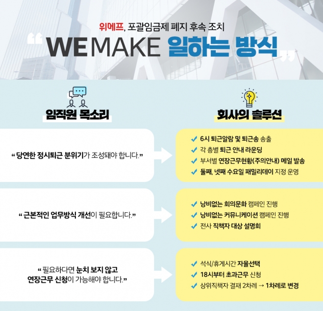 위메프는 포괄임금제 폐지와 함께 연장 근로 없는 주 40시간 근로 단축 정착을 위해 노력하고 있다. 이와 관련해 6시 퇴근 알람 노래를 송출하거나 각 층별 퇴근 안내 라운딩을 하는 등 정시퇴근 분위기를 적극 만들고, 전사적으로 업무방식 체질 개선을 위한 ‘낭비없는 회의문화’ 캠페인을 진행 중이다.