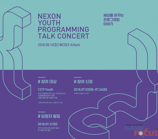 넥슨(대표 이정헌)이 오는 8월 14일 '제 3회 넥슨 청소년 프로그래밍 챌린지 2018(Nexon Youth Programming Challenge, 이하 NYPC)'의 멘토링 프로그램 'NYPC 토크콘서트'를 열고, 이에 앞서 7월 24일까지 참가자를 모집한다.