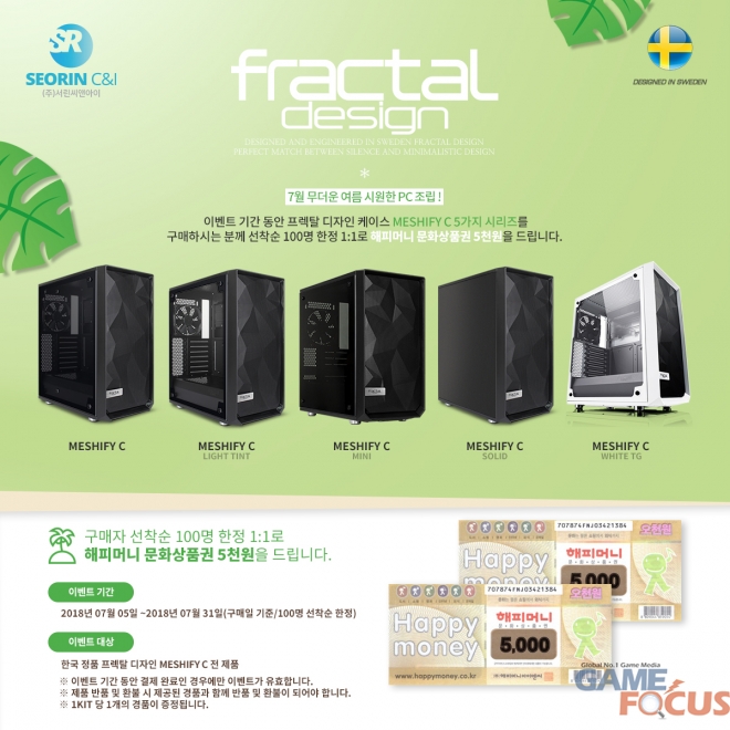 이번 이벤트는 7월 05일부터 07월 31일까지 프렉탈 디자인(Fractal design)사의 '메쉬파이 C 화이트 강화유리 (Meshify C White TG)', '메쉬파이 C 라이트 틴트 강화유리(Meshify C Light TG)', '메쉬파이 C 솔리드(Meshify C SOLID)', '메쉬파이 C 강화유리(Meshify C TG)', '메쉬파이 C MINI 강화 유리(Meshify C MINI TG)' 등을 구매하는 고객을 대상으로 진행되며, 서린씨앤아이는 선착순 100명에게 헤피머니 문화 상품권 5천 원 권을 증정한다.