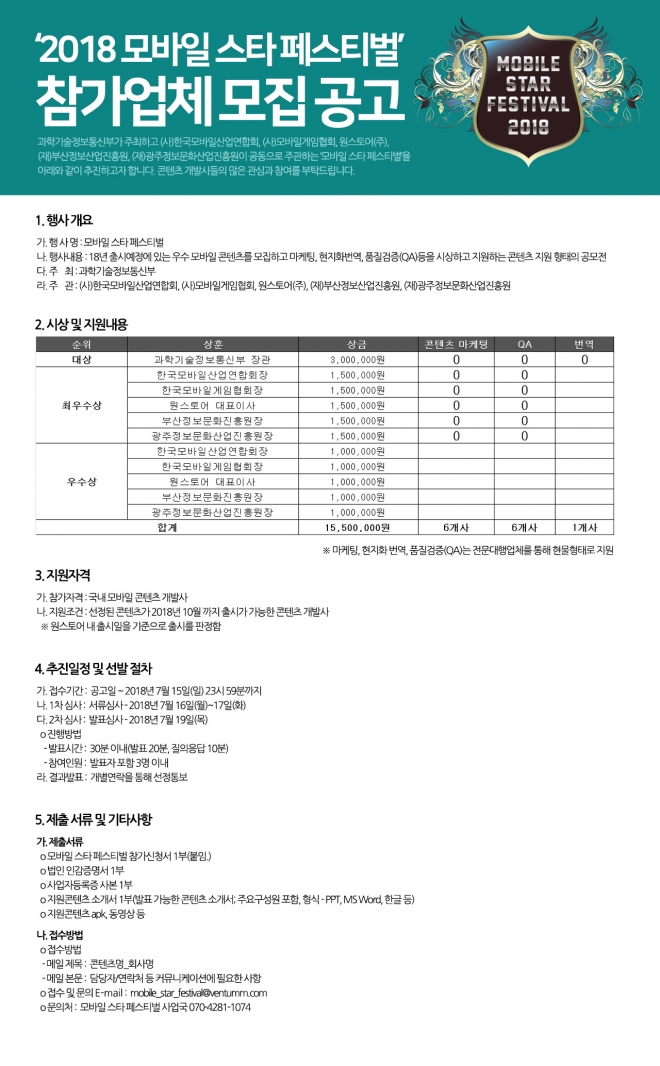 우수한 역량을 지닌 중소 콘텐츠 개발사들을 발굴하고 지원하기 위한 지원형 콘텐츠 어워즈 인 ‘2018 모바일 스타 페스티벌’이 콘텐츠 접수를 시작한다.
