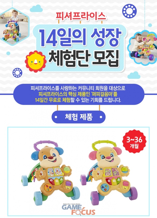 '14일의 성장'은 피셔프라이스 유아완구를 무료로 체험할 수 있는 이벤트로, 아기의 성장 단계에 알맞은 제품을 제공하고 아이 스스로 흥미를 가지고 탐색하며 궁금증을 해결하는 과정을 통해 배움의 즐거움을 아는 아이로 자랄 수 있도록 하자는 취지에서 기획되었다.