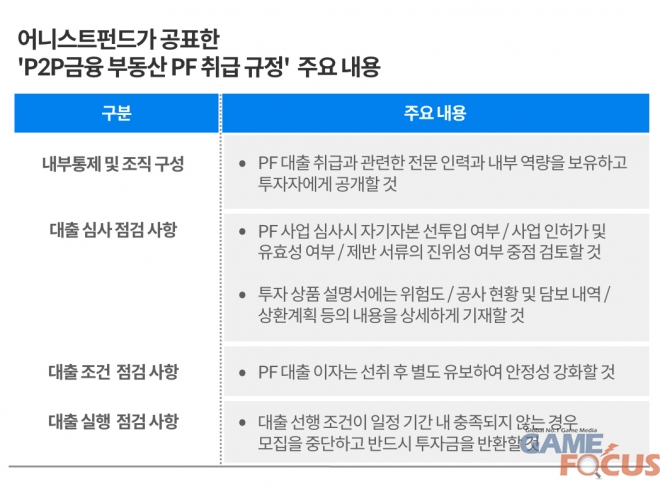 대표적으로, PF대출 취급과 관련된 전문인력과 내부역량을 보유하고 투자자에게 공개할 것, PF 사업 심사시 자기자본 선투입 여부, 사업 인허가 및 유효성 여부, 제반서류의 진위성 여부를 중점 검토할 것, 투자상품 설명서에 위험도, 공사현황, 담보내역, 상환계획 등을 상세히 기재할 것, PF 대출이자는 선취 후 별도 유보하여 안정성을 강화할 것, 대출선행 조건이 일정기간 내 충족되지 않을시 모집을 중단하고 반드시 투자금을 반환할 것 등 P2P금융 업체들이 기본적으로 준수해야 하는 사항들을 강조했다.