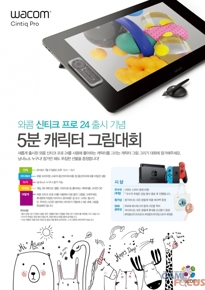 와콤(Wacom)의 한국법인 한국와콤(대표 김주형)이 '와콤 신티크 프로 24(Wacom Cintiq Pro 24)' 제품의 출시를 기념해 오는 21일 와콤 프리미엄 스토어 용산 아이파크몰점에서 '5분 캐릭터 그림 그리기 대회' 이벤트를 실시한다.