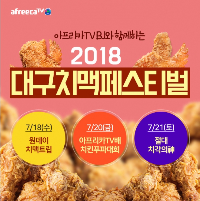 아프리카TV는 18일부터 22일까지 대구 두류 공원 일대에서 5일간 진행되는 '2018 대구 치맥 페스티벌' 행사에 참여한다고 밝혔다. 대구 치맥 페스티벌은 2013년부터 매년 이어진 축제로 해마다 규모가 커지고 있는 대구 지역의 대표 지역 축제이다.