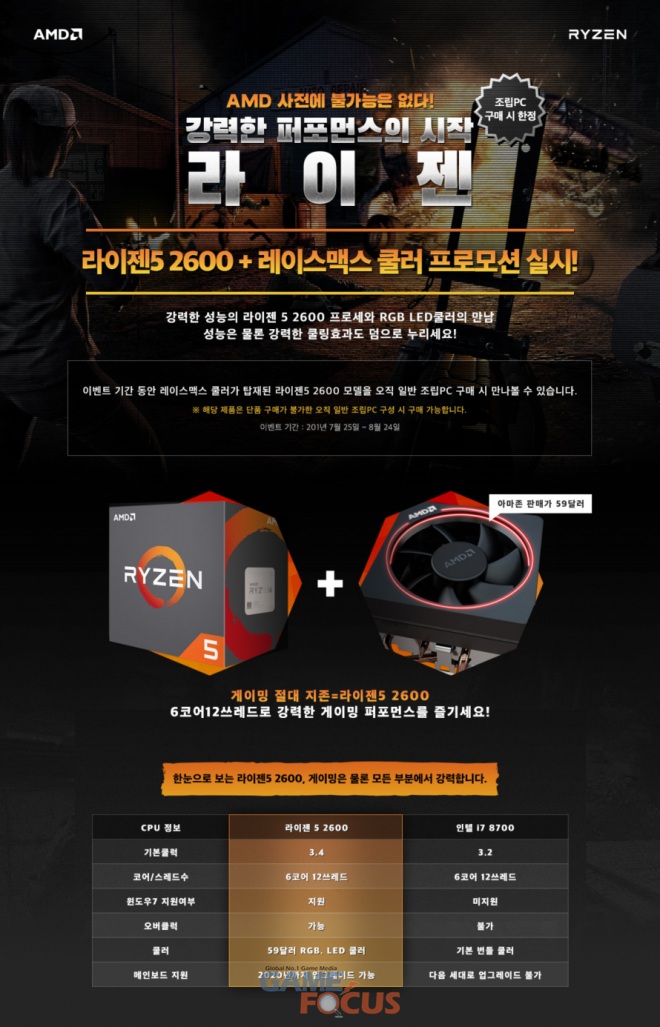 프로모션을 통해 '라이젠 5 2600'이 탑재된 시스템을 구매하면 '레이스 맥스 RGB LED 쿨러'가 기본 탑재되어 강력한 쿨링 효과와 화려함을 동시에 누릴 수 있다.