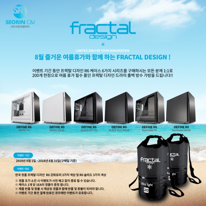 (주)서린씨앤아이(대표: 전덕규)는 스웨덴 남서부 최대 무역항 도시 예테보리(Gothenburg)에서 시작된 저소음 지향의 스칸디나비아 디자인을 추구 하는 케이스, 쿨링 브랜드 프렉탈 디자인(Fractal design)사의 '디파인 R6 (Define R6)' 케이스 시리즈 구매자를 대상으로 200명 한정 20L 드라이 롤백 방수 가방 증정 이벤트를 진행한다.