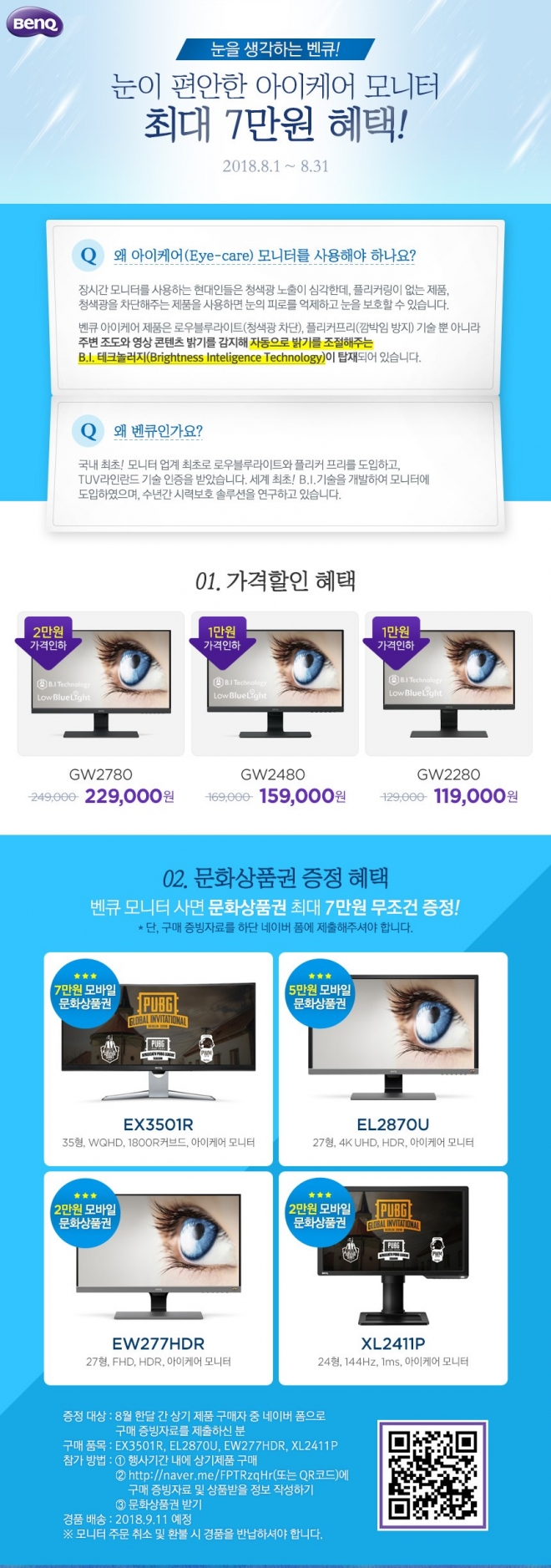 벤큐 모니터 공식 수입원 피치밸리와 함께 8월 한달 간 진행되는 이번 행사는 벤큐의 아이케어 제품 중 'EX3501R', 'EL2870U', 'EW277HDR', 'XL2411P'를 구매하고 네이버폼으로 구매 증빙자료를 올린 전원에게 문화상품권을 2만원에서 최대 7만원 증정하는 행사와 'GW2780', 'GW2480', 'GW2280' 제품에 최대 2만원의 가격을 인하하는 행사로 구성된다.