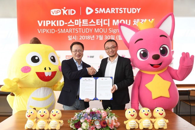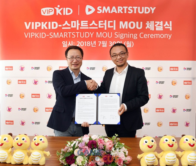 온라인 교육업체 브이아이피키드(VIPKID, 대표 및 창업자 미원쥐안)가 한국의 글로벌 콘텐츠 기업 스마트스터디(SMARTSTUDY, 대표 김민석)와 지난 30일 콘텐츠 공유 및 지적재산권(IP) 협력을 위한 업무협약(MOU)을 체결했다.