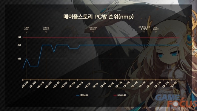 방학 강자로 불리며 여름 업데이트 마다 순위 반등을 거듭해 PC방 점유율 TOP10을 굳건히 지켜온 '메이플스토리'가 올해 6월 '검은마법사' 등장 소식을 알림과 동시에 무서운 속도로 인기 상승 곡선을 그리며 PC방 점유율 순위 TOP3에 안착, 서비스 10년이 훌쩍 넘은 타이틀의 새로운 저력을 과시했다.