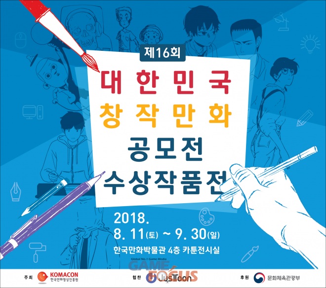 (재)한국만화영상진흥원(이사장 김동화, 이하 진흥원)이 문화체육관광부(도종환 장관)와 저스툰(대표 연준혁)의 후원을 받아 우수 만화 창작 인재 발굴을 위해 진행한 제16회 대한민국창작만화공모전의 수상자가 선정됐다.