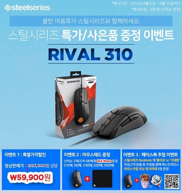 먼저 오는 8월 16일까지 열리는 ‘쿨~한 여름 휴가, 특가 사은품 이벤트’가 진행, 해당기간 동안 ‘라이벌310’ 마우스 구매자 중 선착순 300명들에게만 정가인 93,500원에서 36% 대폭 할인된 59,900원의 특가 혜택과 사은품을 증정한다. 이 기간 동안 럭키드로우도 열려 1번째, 5번째, 10번째, 30번째 구매자들을 당첨하여 ‘게이머들의 국민패드’라는 별칭을 지닌 스테디셀러 ‘Qck Mass’ 마우스 패드를 증정한다. 또한 이벤트 참가자들이 스틸시리즈 페이스북에 ‘좋아요’ 또는 제품평을 작성할 시 추첨을 통해 베스킨라빈스 아이스크림 및 핑크라떼 등 한여름의 시원함도 선사한다.
